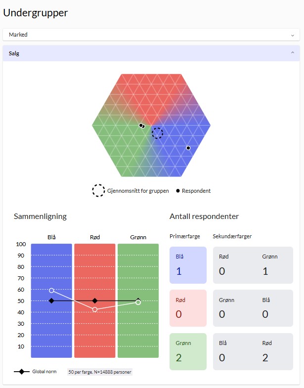 Team og prosjektgrupper kan også sammenligne sin egen profil med den totale gruppen: «Er fargeprofilen vår representativ eller ikke? Hva betyr forskjellene for oss og organisasjonen?»