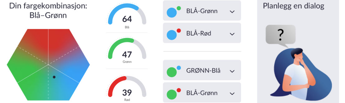 - Individuell læring om bruk av Rød av Rød, Blå og Grønn i team, kommunikasjon, konflikthåndtering, med mer.